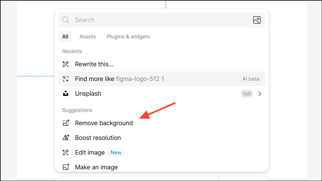 Step 2: Click Actions in the toolbar and choose Remove background. Figma’s AI will process the image and isolate the main subject, removing the background in seconds.