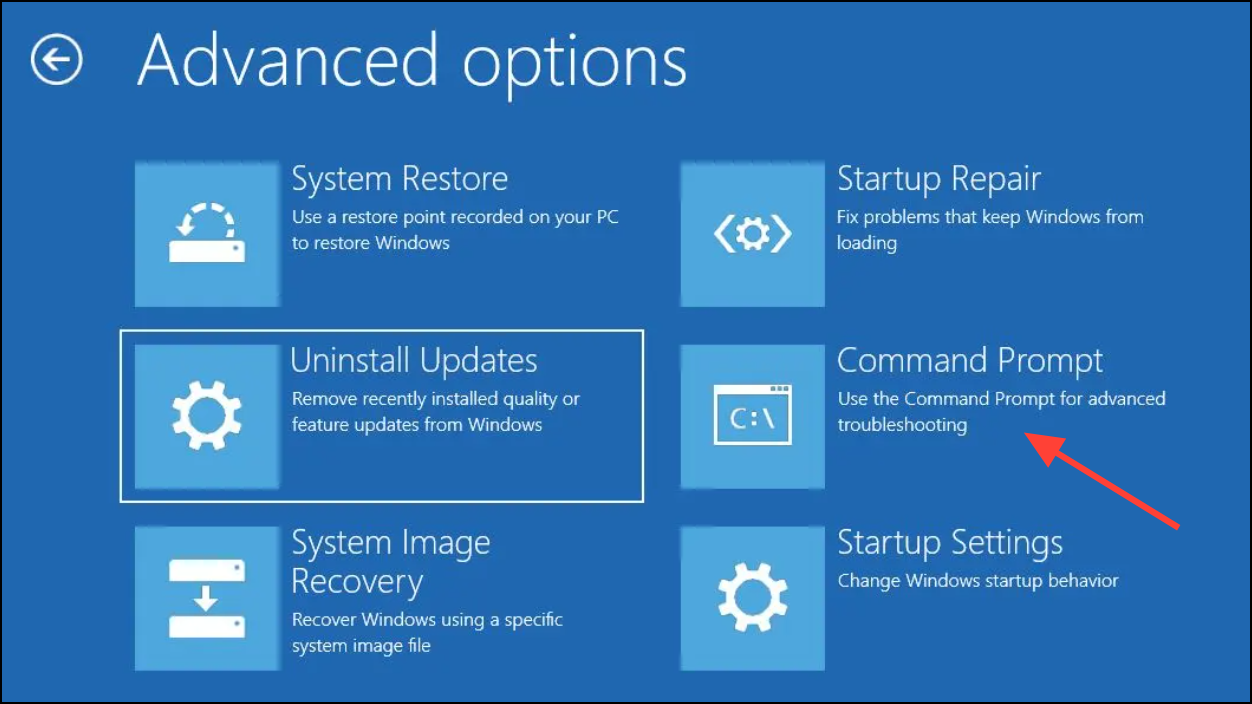 Step 2: In WinRE, navigate to Troubleshoot > Advanced options > Command Prompt. If prompted for BitLocker recovery, you must enter the recovery key before proceeding.