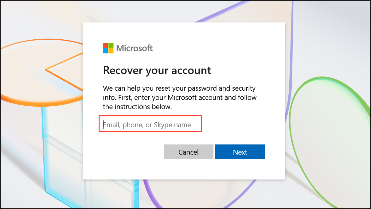 Step 2: Enter the email address or phone number linked to your Microsoft account, then select Next. This ensures Microsoft can identify your account and initiate the reset process.