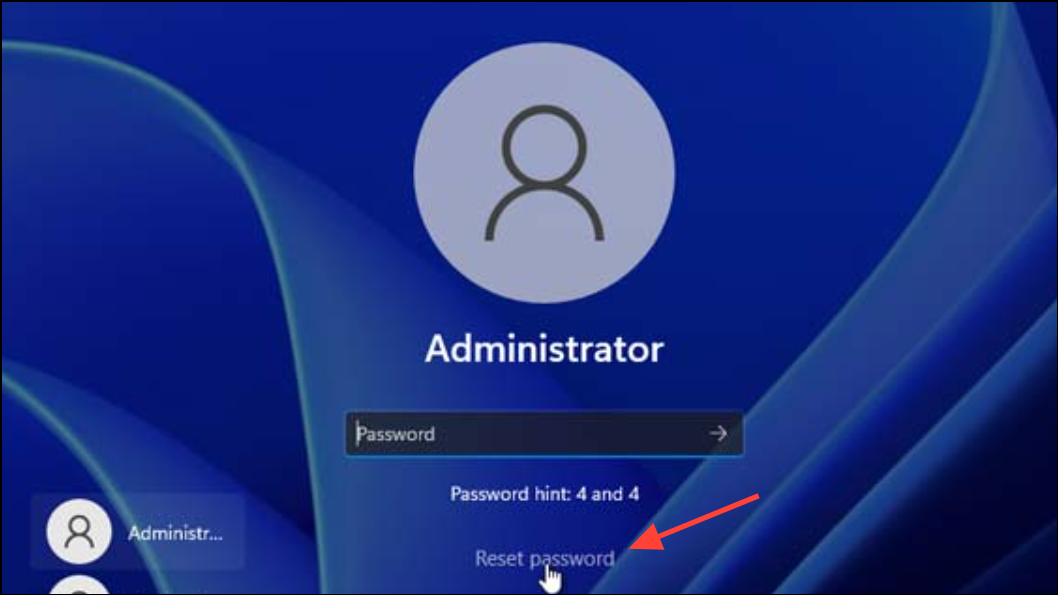 Step 1: On the Windows 11 lock screen, attempt to sign in with an incorrect password. After one or more failed attempts, a Reset password option appears beneath the password field.