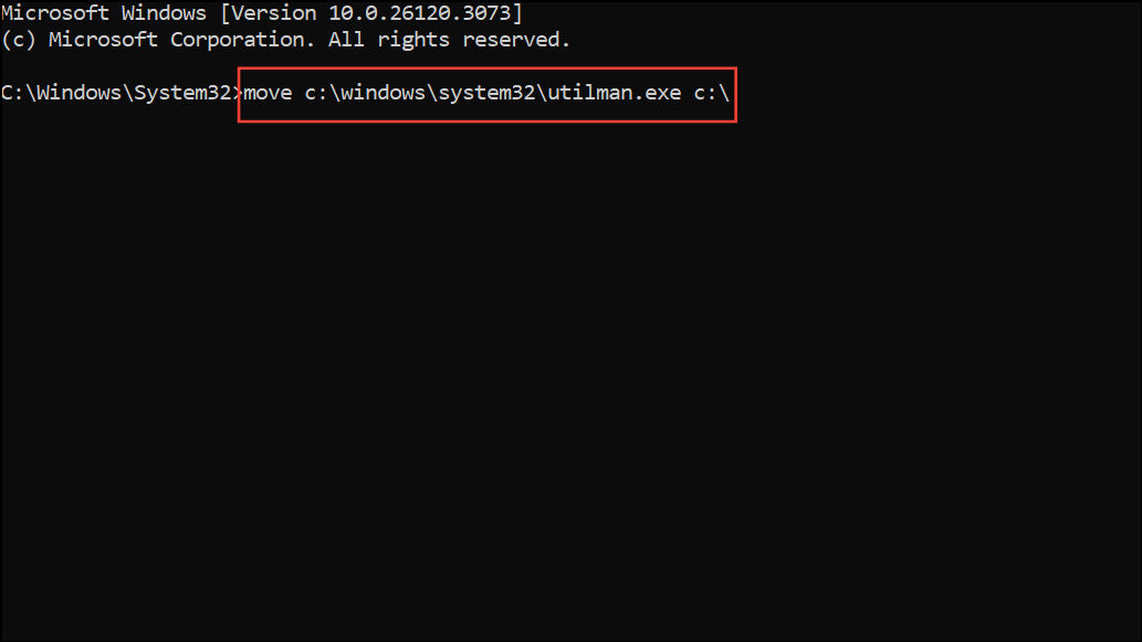 Step 6: After regaining access, restore the original Accessibility Utility to maintain normal system functionality. Open Command Prompt as administrator and run the following commands: