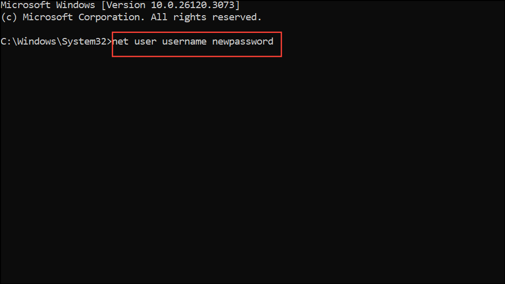 Step 5: To reset the password for your local account, type the following command, replacing username with your actual account name and newpassword with your chosen password: