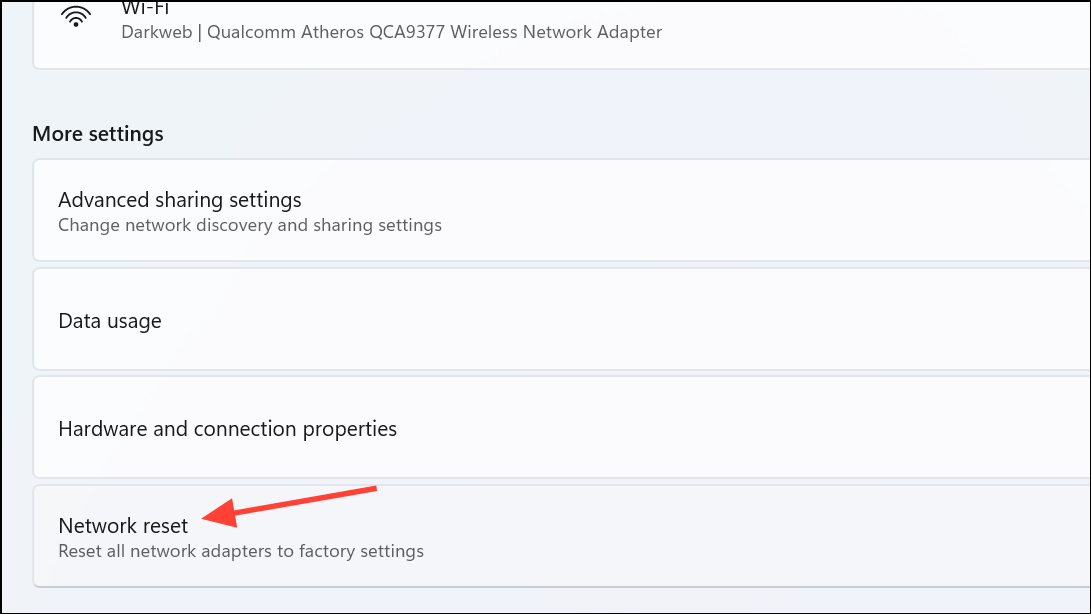 Step 4: Under the "More settings" section, choose Network reset. This option initiates the process to remove and reinstall all network adapters and revert related settings to their defaults.