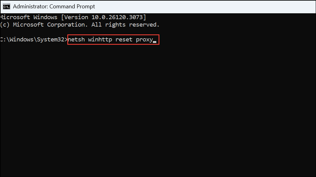 Step 2: Enter the following commands one by one, pressing Enter after each. These commands reset proxy settings, Winsock (Windows Sockets API), TCP/IP stack, and clear DNS cache: