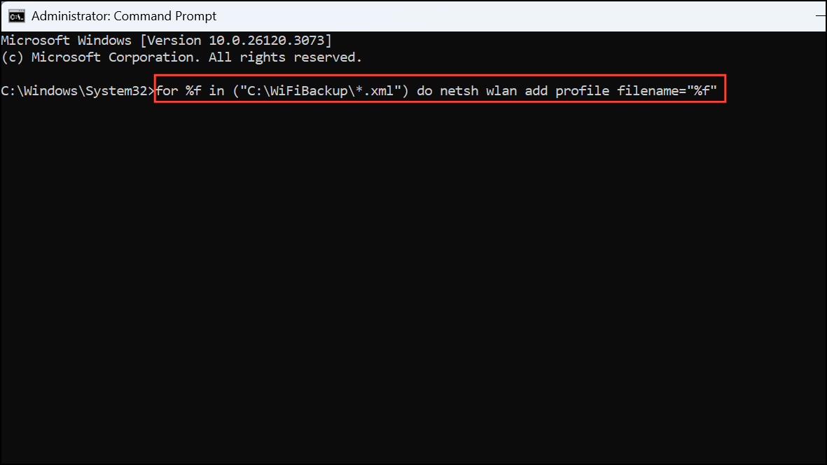 This command imports all saved Wi-Fi profiles back to your system, allowing you to reconnect without re-entering each password.
