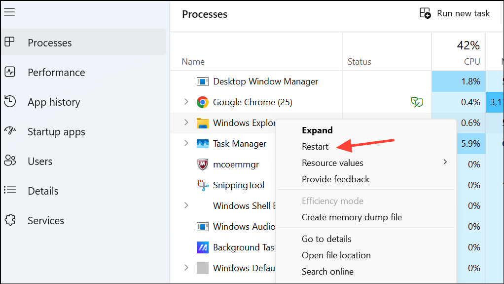 Step 2: Right-click Windows Explorer and choose Restart. Your desktop may briefly disappear and reload.