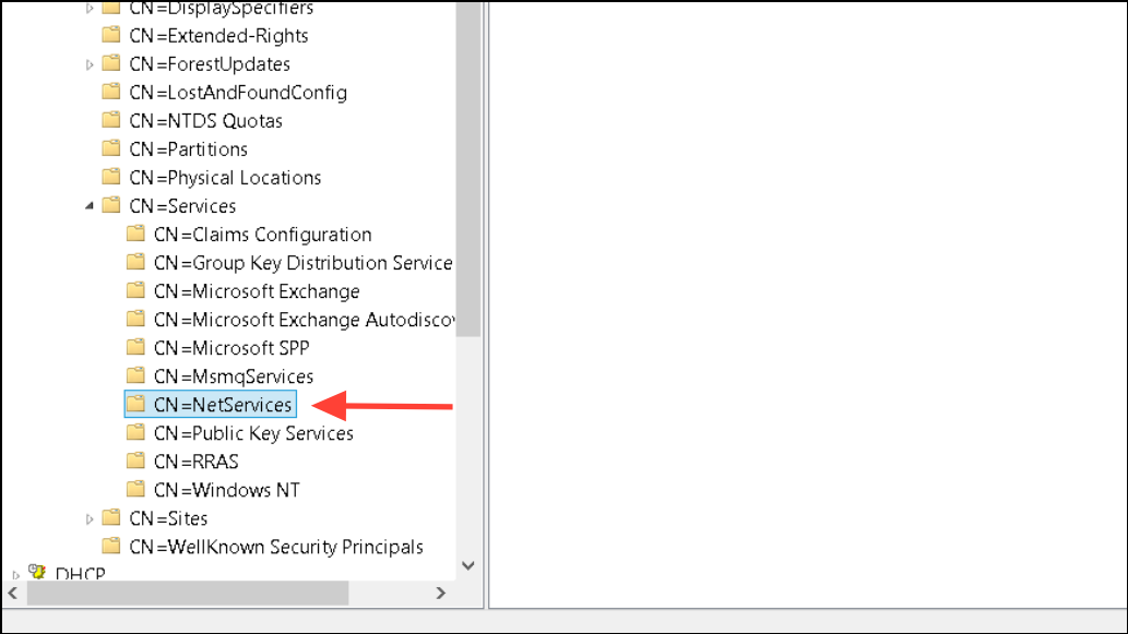 Step 2: Connect to the Default naming context. Expand the domain structure, then navigate to CN=NetServices,CN=System,DC=yourdomain,DC=com.