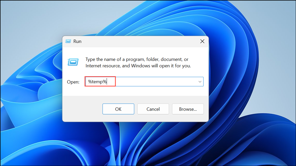 Step 1: Press Windows + R to open the Run dialog, then type %temp% and press Enter.