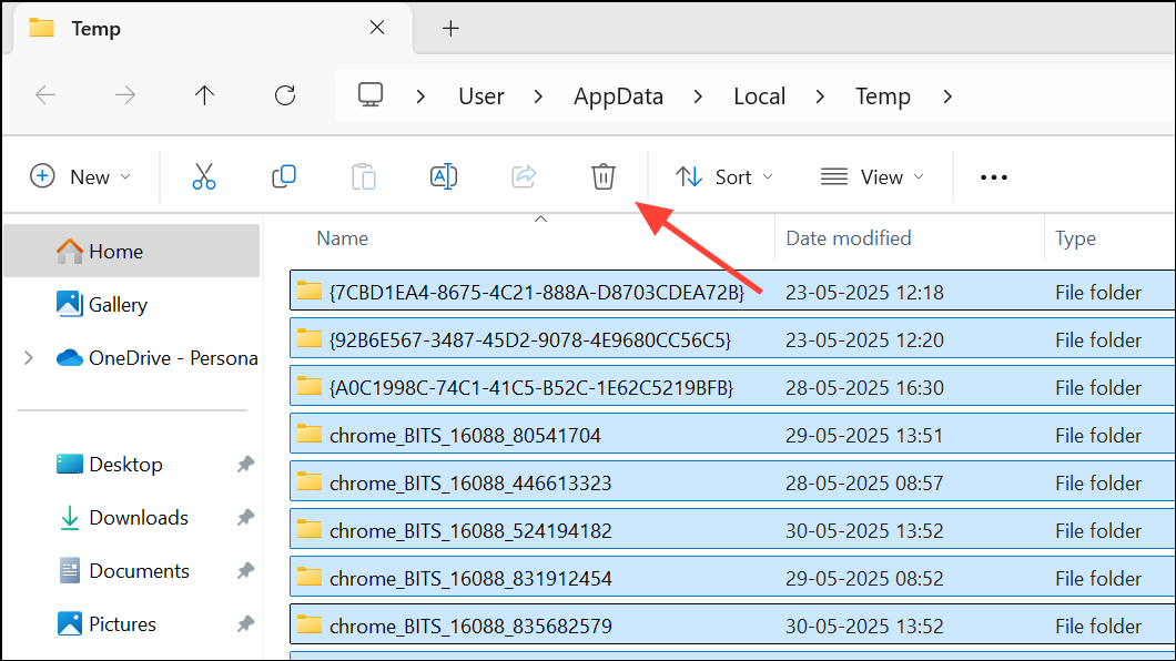 Step 2: Select all files in the Temp folder (Ctrl + A), then right-click and choose Delete. Skip any files that cannot be deleted because they're in use.