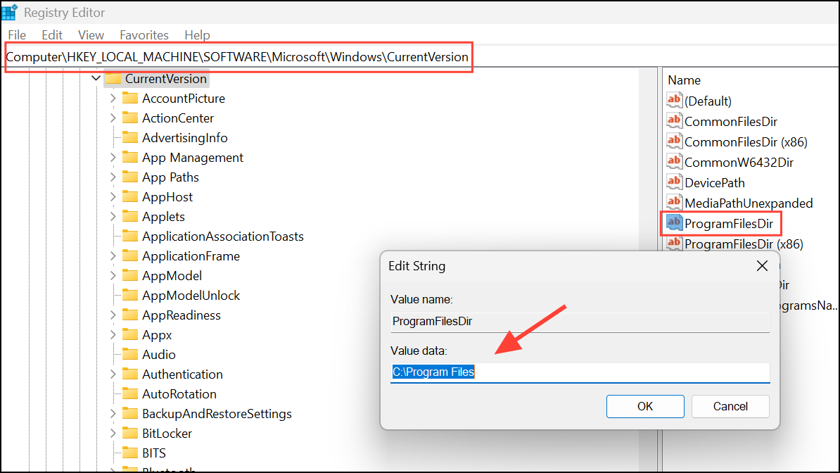 To check the default Program Files path, open regedit and navigate to HKEY_LOCAL_MACHINE\SOFTWARE\Microsoft\Windows\CurrentVersion. Ensure the ProgramFilesDir value is set to C:\Program Files.