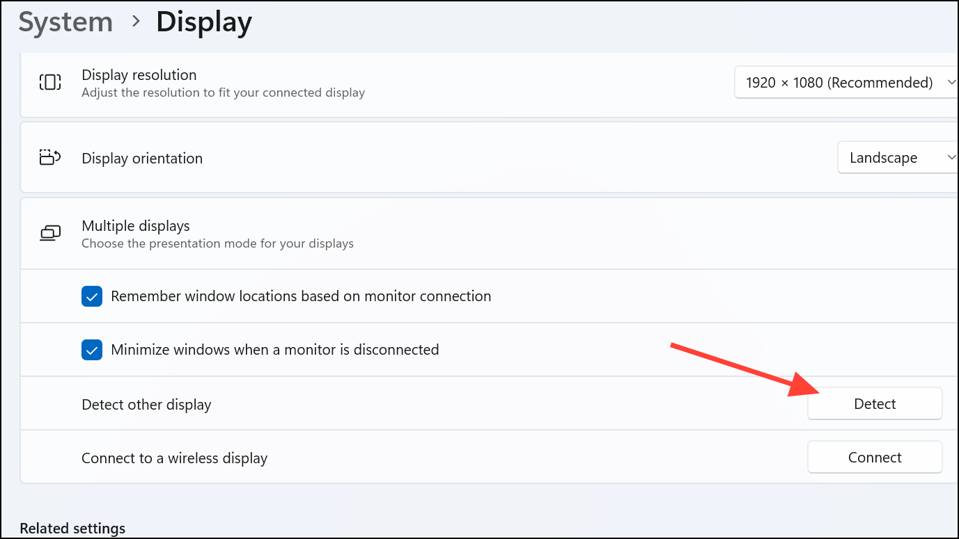 Step 3: Click the Detect button. This forces Windows 11 to scan for connected displays, even if they weren’t automatically recognized during startup.