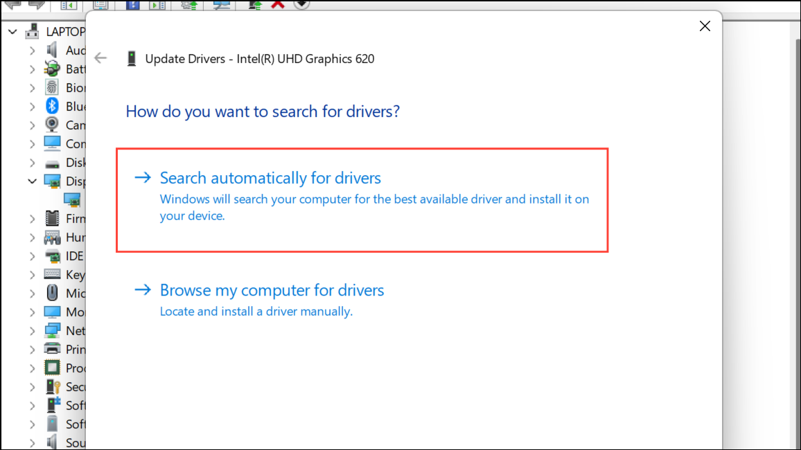 Step 3: Select Search automatically for drivers. If Windows finds an update, follow the prompts to install it. If no update is found, visit your graphics card manufacturer’s website (NVIDIA, AMD, Intel) to download and install the latest drivers manually.