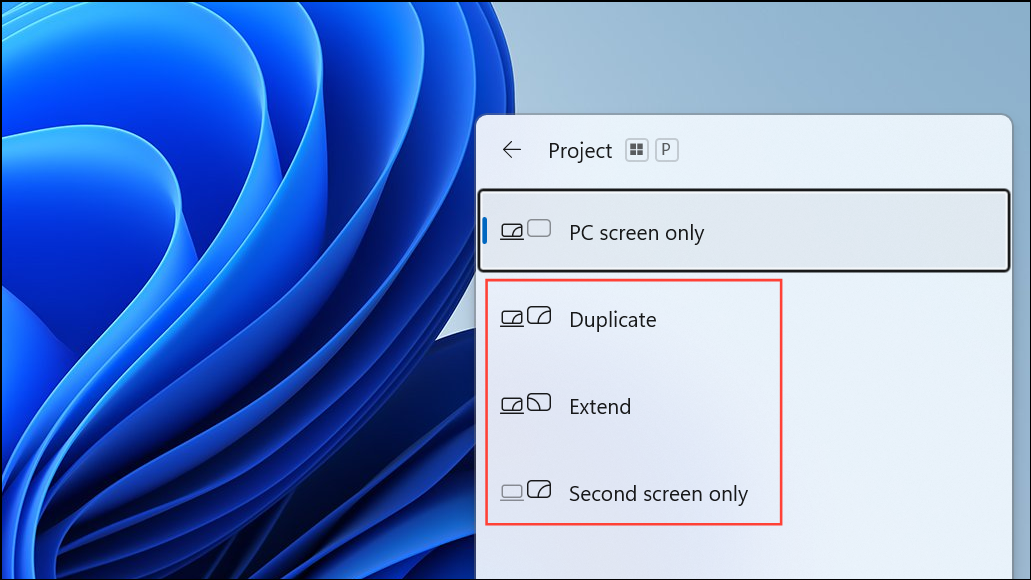 Step 1: Press Windows key + P to open the Project menu. Cycle through options such as Duplicate, Extend, or Second screen only to see if the external monitor responds.