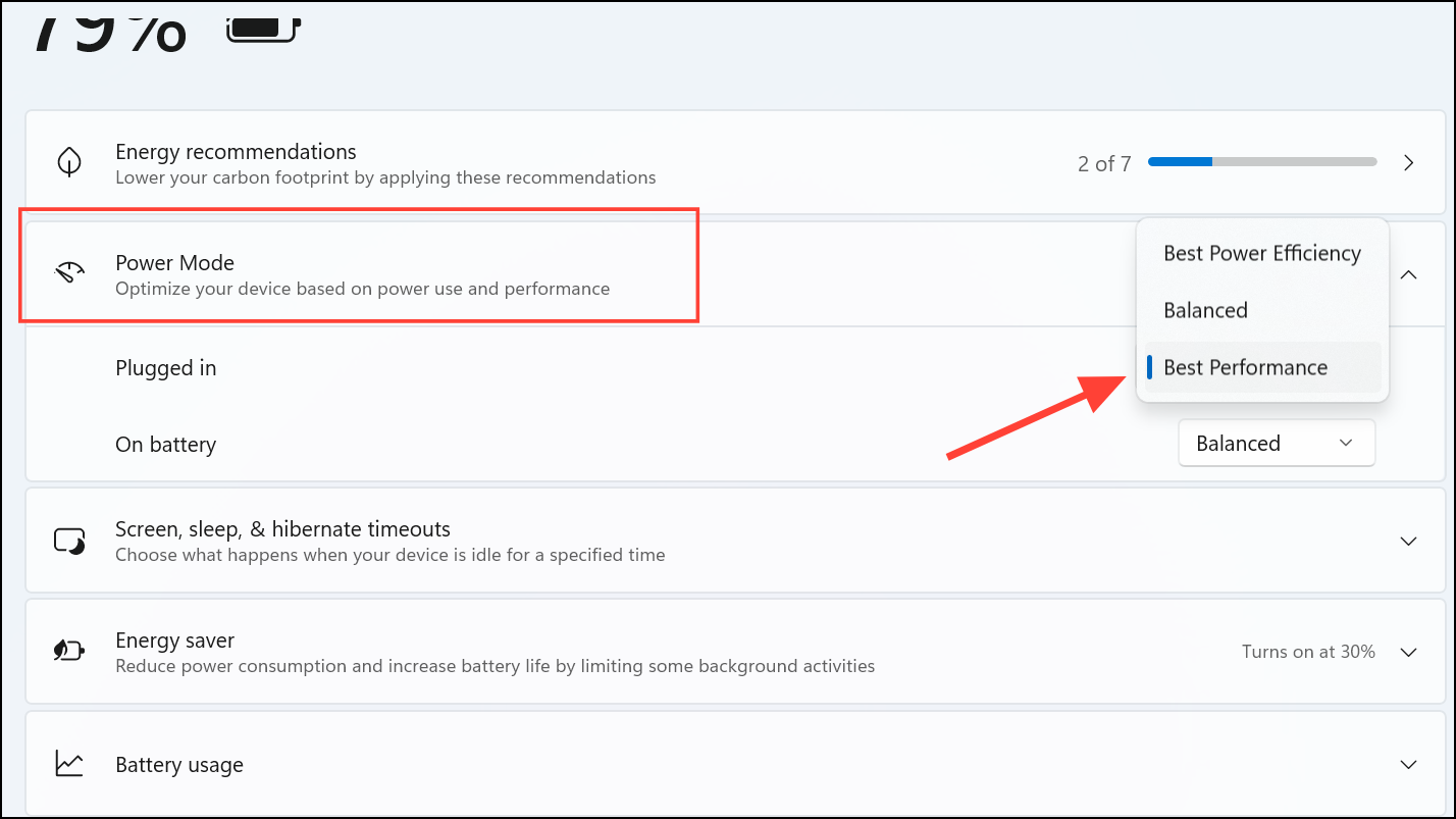 Step 2: Select Power mode and choose Balanced or High performance to prevent unnecessary CPU throttling.