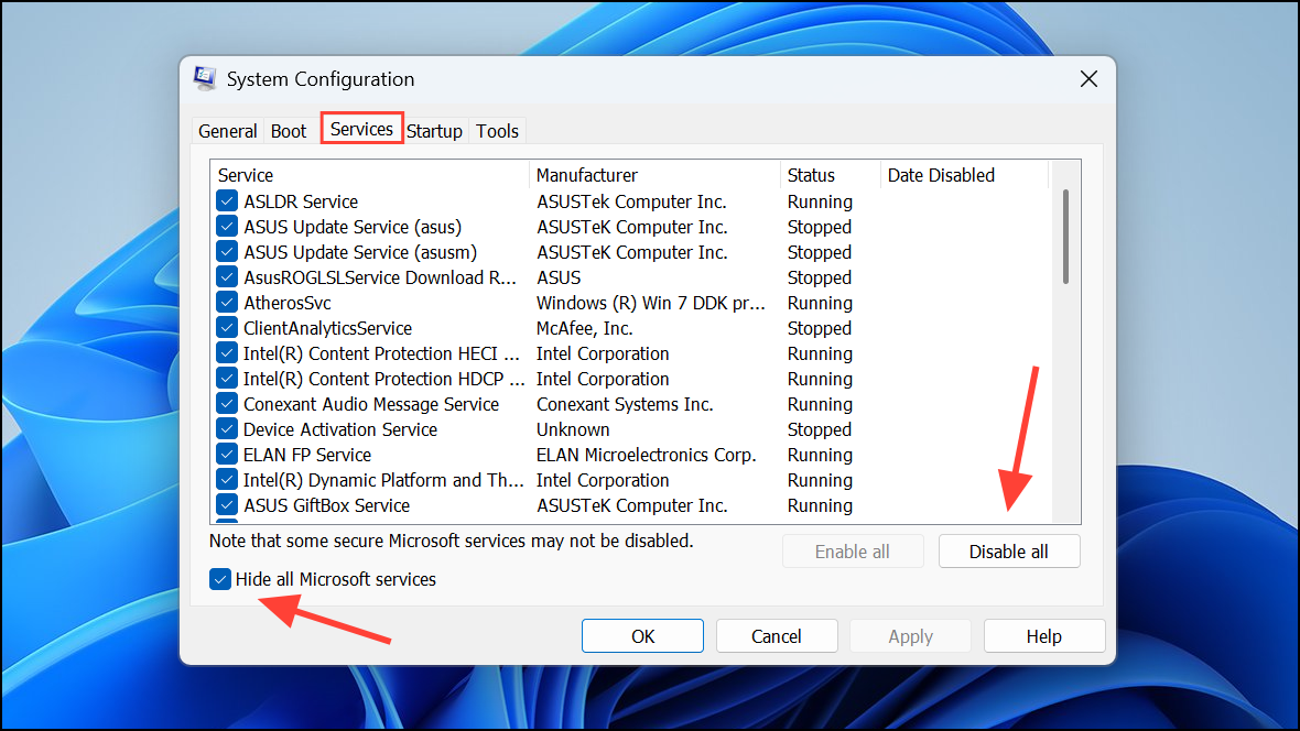 Step 3: For persistent issues, perform a clean boot. Open msconfig, hide all Microsoft services, and disable remaining third-party services. Reboot and monitor CPU usage. Gradually re-enable services to find the problematic one.