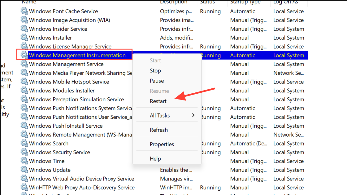 Step 2: Locate Windows Management Instrumentation and related services, right-click, and choose Restart.