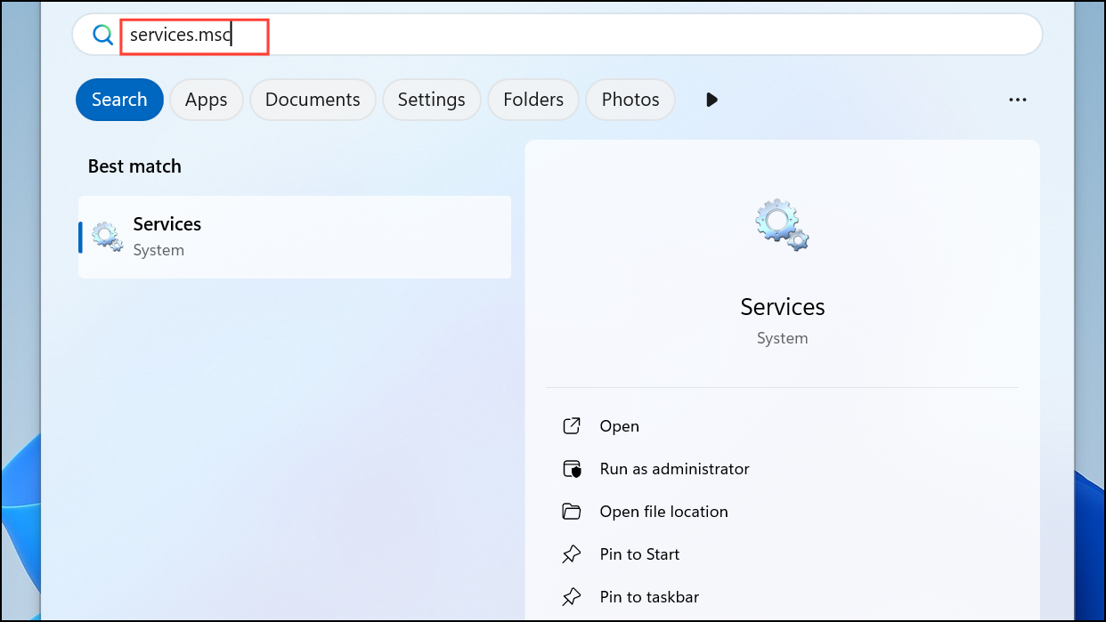 Step 1: The WMI Provider Host and other core services may become bloated over time. To restart these, type services.msc in Windows Search and hit Enter.