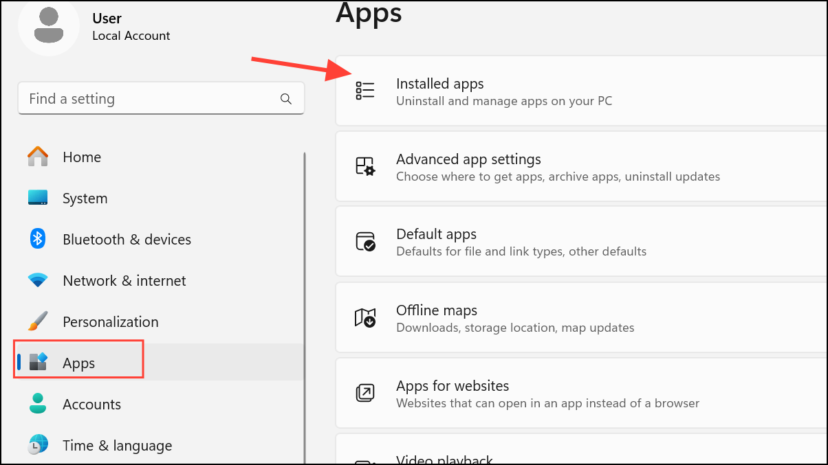 Step 1: If ntdll.dll errors appear only when using a specific program, open Settings with Windows + I and go to Apps > Installed apps.