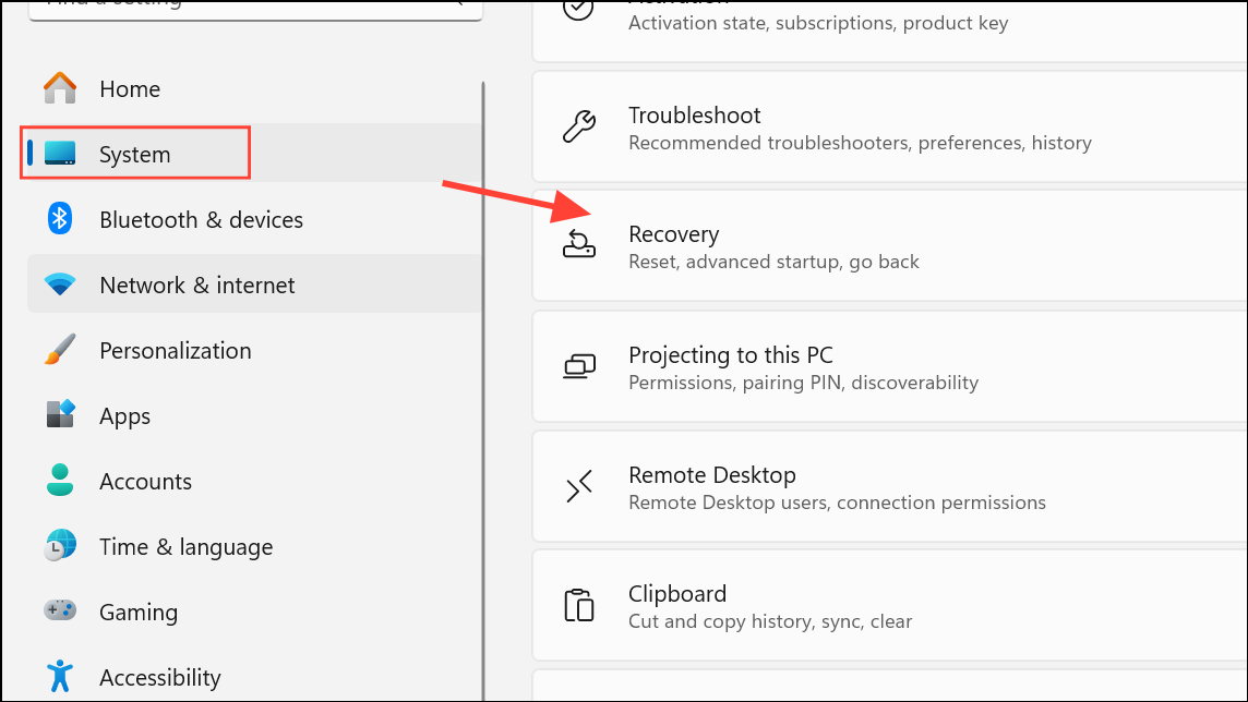 Step 1: Open Settings with Windows + I and go to System > Recovery.