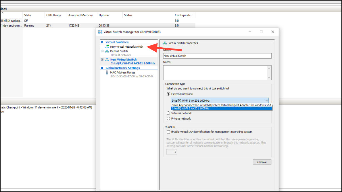 Step 3: If your VM is not connected to an external switch, create one by selecting New virtual network switch and choosing External. Assign the switch to the appropriate network adapter and apply the changes.
