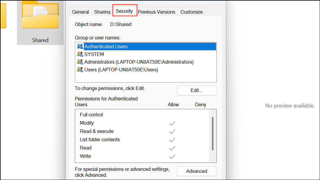 Step 1: Right-click the folder that is denying access and select Properties. In the Properties window, switch to the Security tab. This tab displays the current permissions for users and groups.