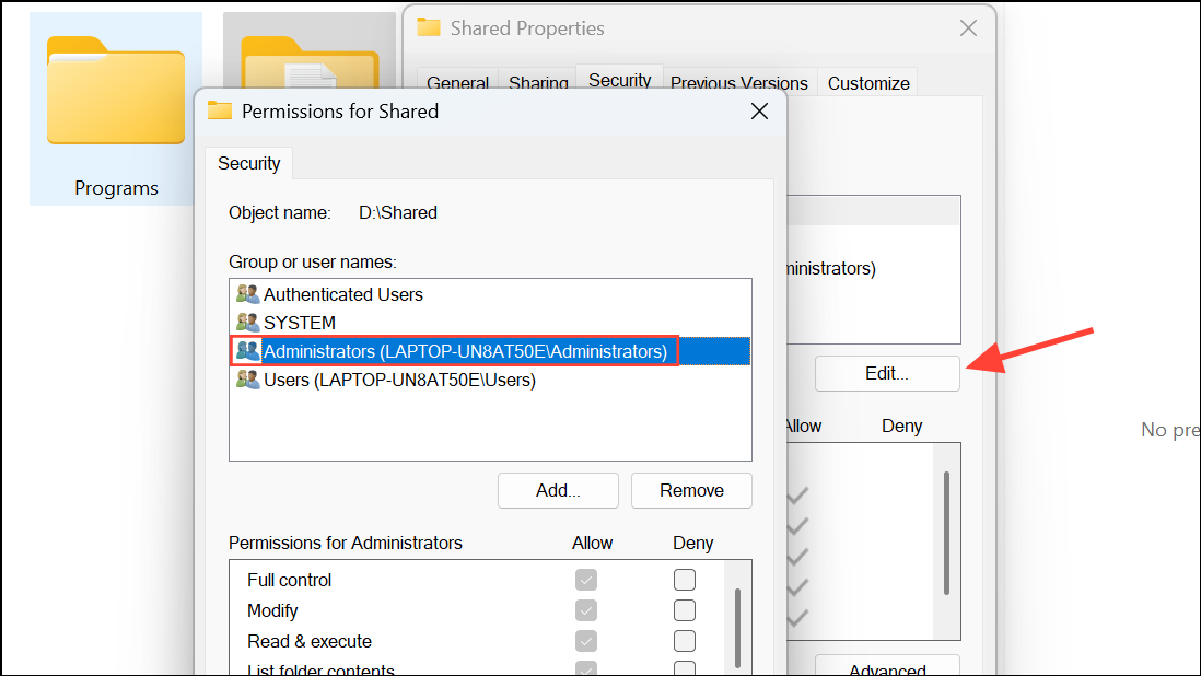 Step 2: Click the Edit button to modify permissions. In the Permissions window, select Administrators from the list. If the group is missing, click Add, enter Administrators, and confirm.