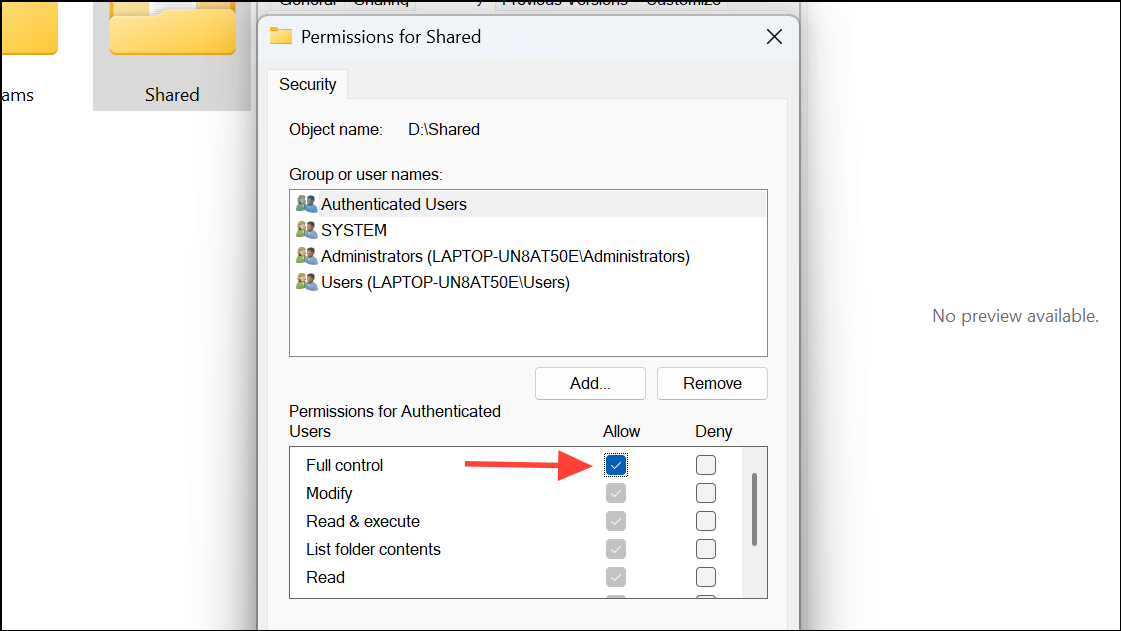 Step 3: With Administrators highlighted, check the Full control box under Allow. This action grants complete access to the folder for all members of the Administrators group.