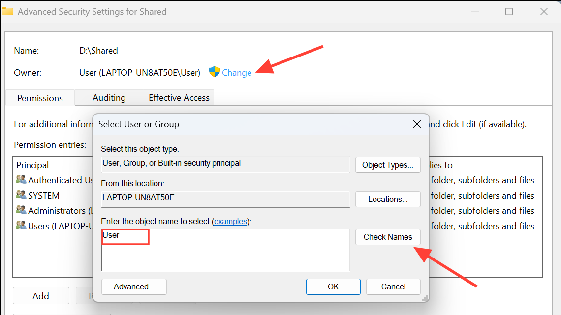 Step 2: At the top of the Advanced window, locate the Owner field and click Change. In the dialog box, type your user account name or Administrators and click Check Names to verify.