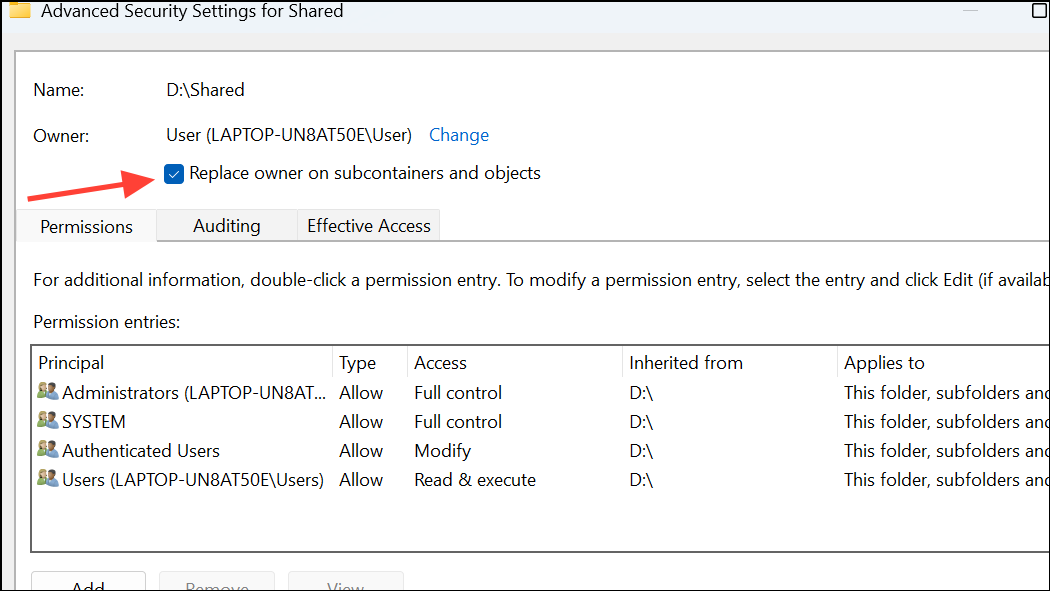 Step 3: After verifying, click OK. Check the box labeled Replace owner on subcontainers and objects to apply the change to all files and folders within the directory.