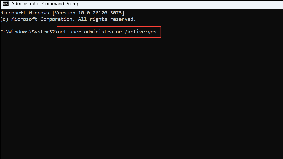 Step 2: In the command prompt window, enter the following command to activate the built-in Administrator account: