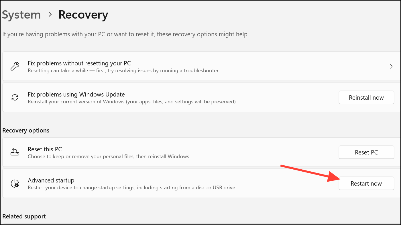 Step 1: Open Settings by pressing Windows + I. Go to System > Recovery, then click Restart now under Advanced startup.