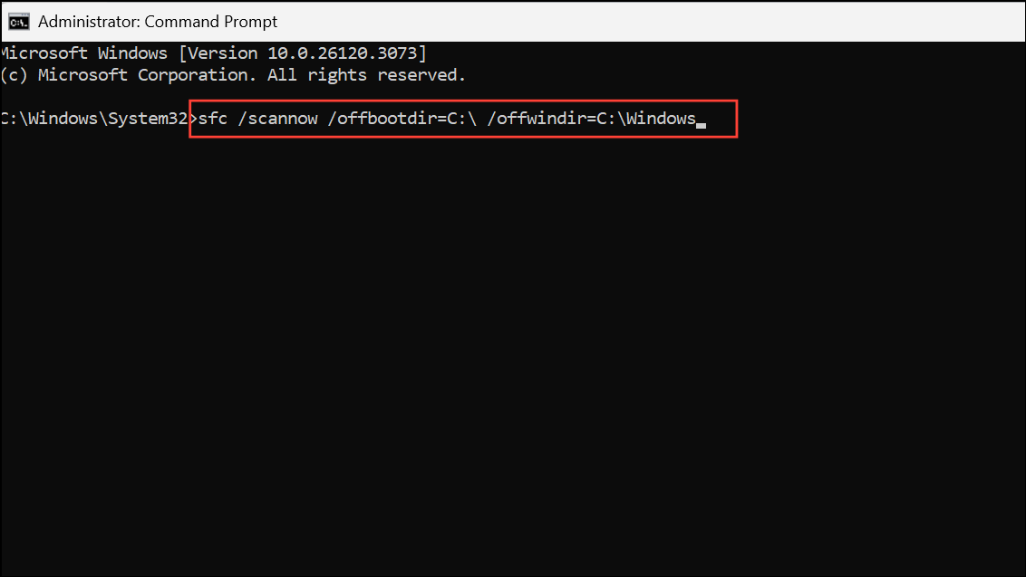 Adjust C: if your Windows installation is on a different drive. This command checks and repairs system files offline, which can succeed when online repairs fail.
