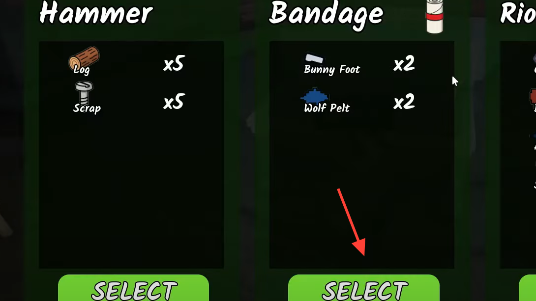 Step 4: Plan to craft Bandages later in the run once you rebuild the Anvil; crafting uses 2 rabbit feet and 2 wolf pelts.