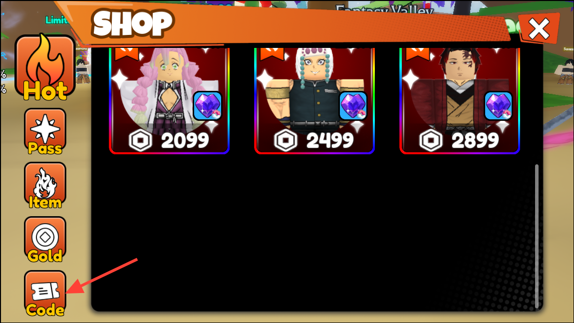 Step 3: Select the Code (ticket) button within the Shop to open the redemption window.