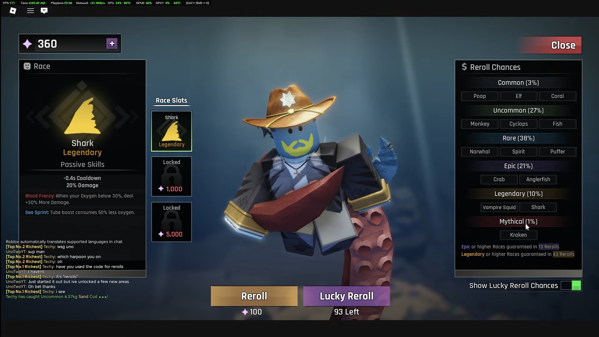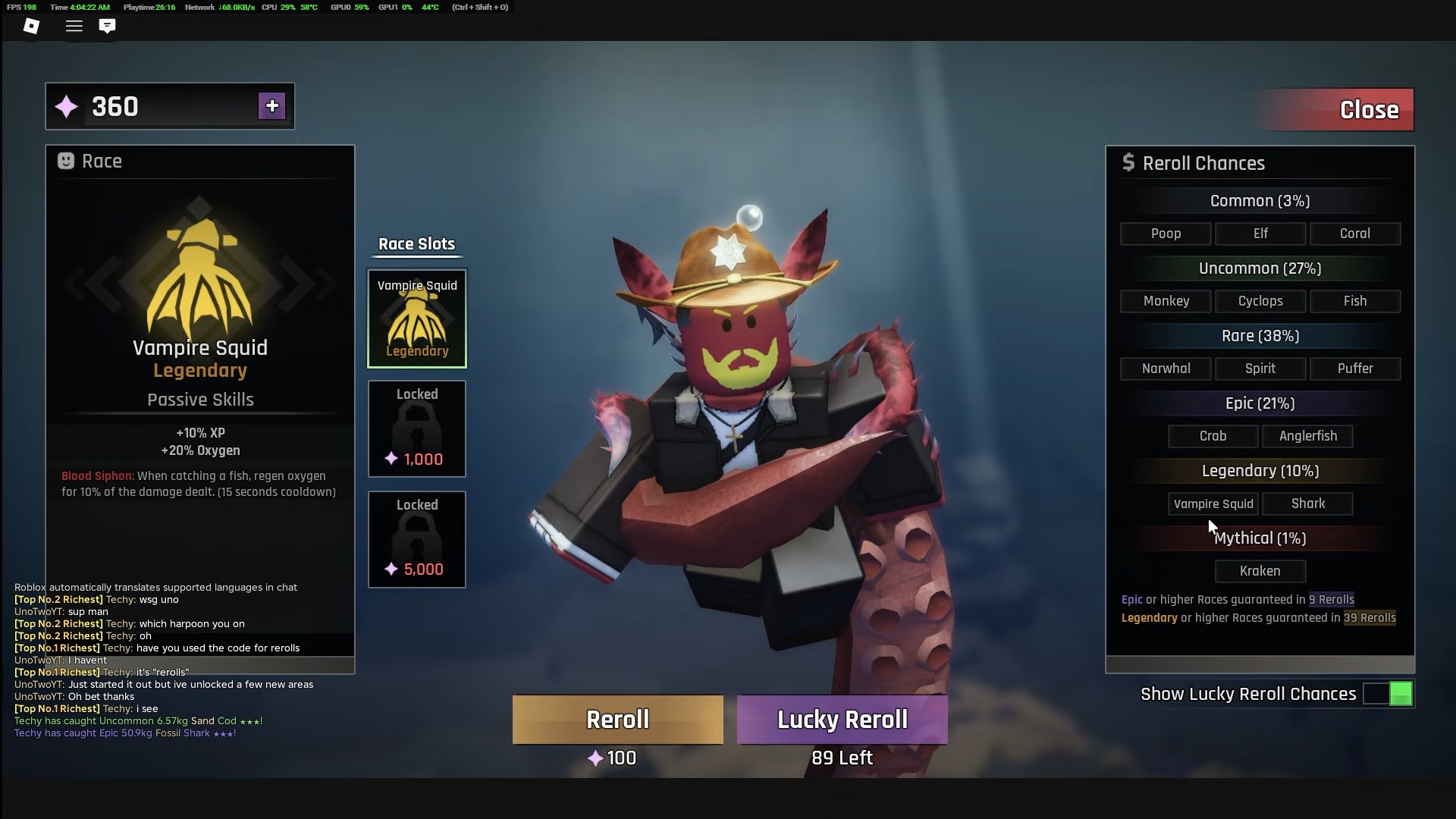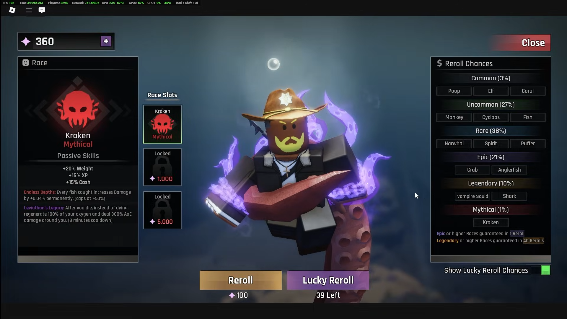 Kraken stands as the undisputed best race. Its +20% Weight bonus exceeds all other races, while +15% XP and +15% Cash accelerate progression. The Endless Depths passive grants +0.04% damage per fish caught, capping at +50% after 1,250 fish—a permanent scaling buff that grows throughout your playthrough. Leviathan's Legacy functions as a second life: when oxygen depletes completely, you instead regenerate 100% oxygen and deal 300% AoE damage around your character. This ability has an 8-minute cooldown but can save critical deep-sea expeditions when oxygen runs low unexpectedly.