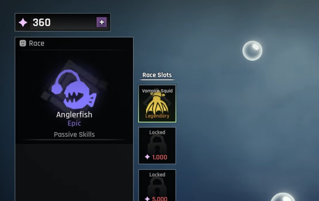 Prioritize your primary race slot for combat-focused races (Kraken, Shark, Vampire Squid, Crab). Use the secondary slot for utility races like Anglerfish (Abyssal Light for dark biomes) or races with non-combat passives. If you pull a strong Legendary race like Shark, consider keeping it rather than burning all Shards chasing the 1% Mythic rate.