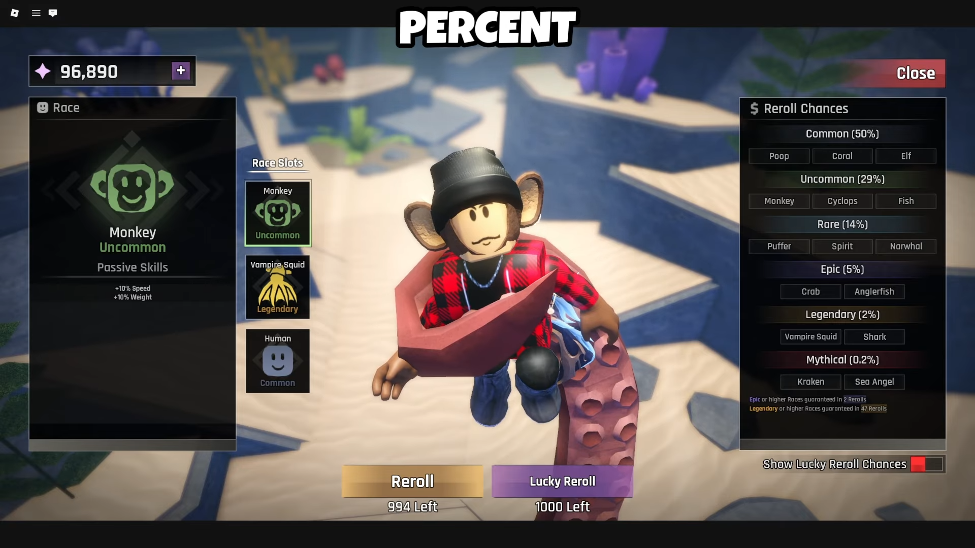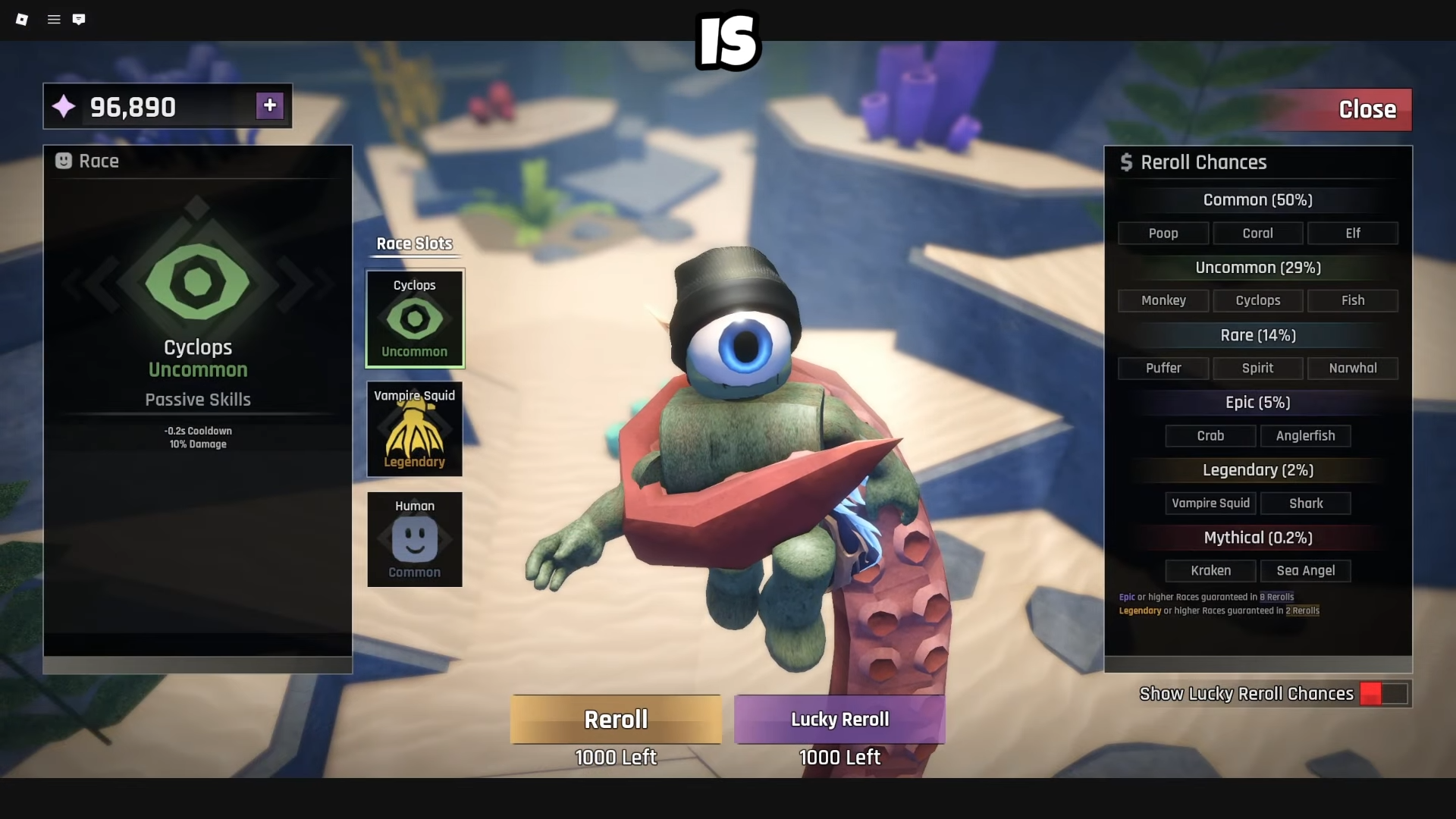 Step 2: Select either Regular Reroll (100 Shards) or Lucky Reroll (450 Shards). Lucky Rerolls increase Mythic race chances from 0.2% to 1% and reduce Common race pulls from 50% to 3%.