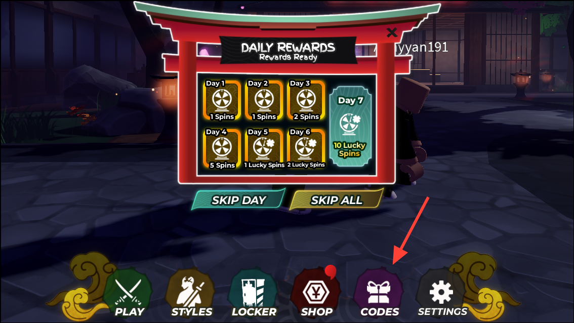 Step 2: On the main screen, click the Codes button (typically on the bottom of the UI) to open the redeem window.