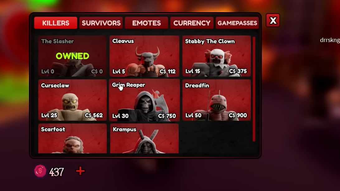 Step 2: Browse the Killer or Survivor tabs to view each character’s cost and passive ability description. Take note of both the coin price and any level requirement attached to the character.
