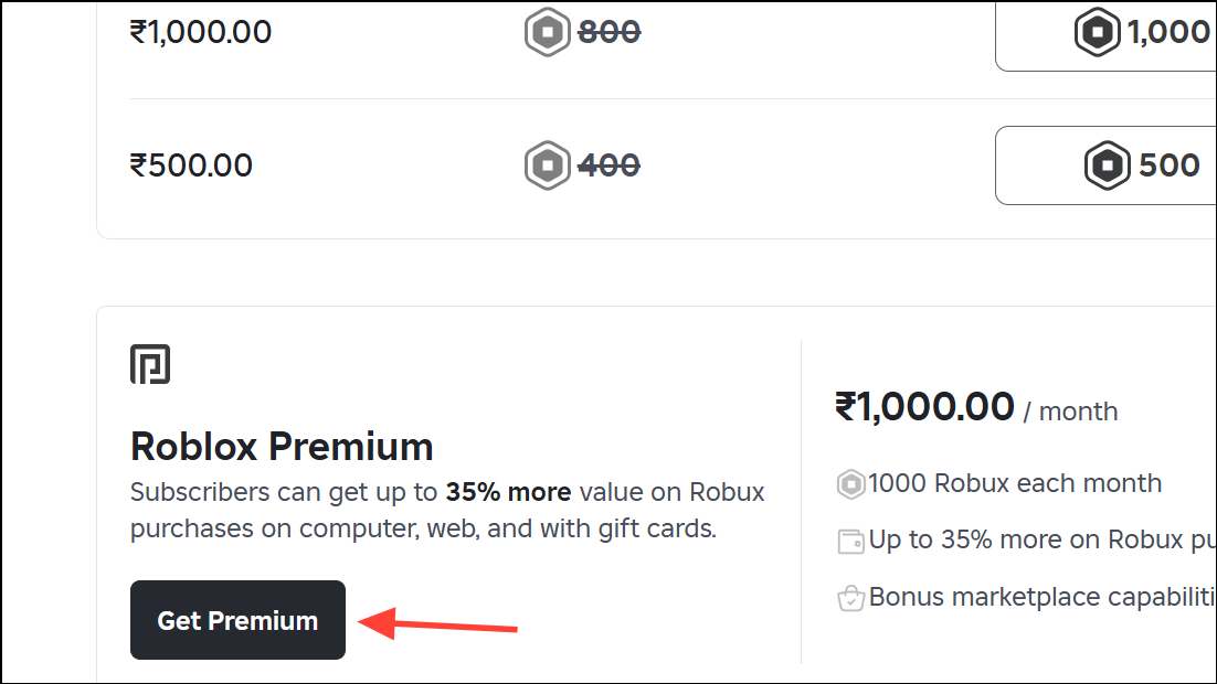Step 1: Go to the Robux or Premium purchase flow on roblox.com and select the amount or membership you want.