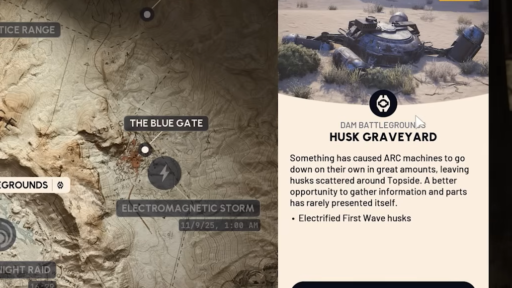 Electromagnetic Storms appear to improve drop rates from electrified husks, so deploying during that weather condition alongside the Husk Graveyard event is the most efficient no-combat farming method. The Old Battleground area on Dam Battlegrounds and the outskirts of Buried City are reliable spots to find clusters of husks during the event.