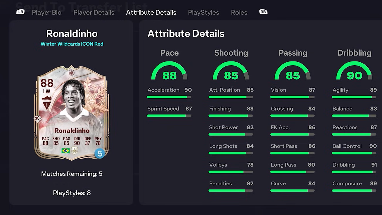 | Winter Wildcards Icon Ronaldinho | 94 LW | 92 / 90 / 91 / 96 | Finesse Shot+, Technical+ | 9M+ coins on market |