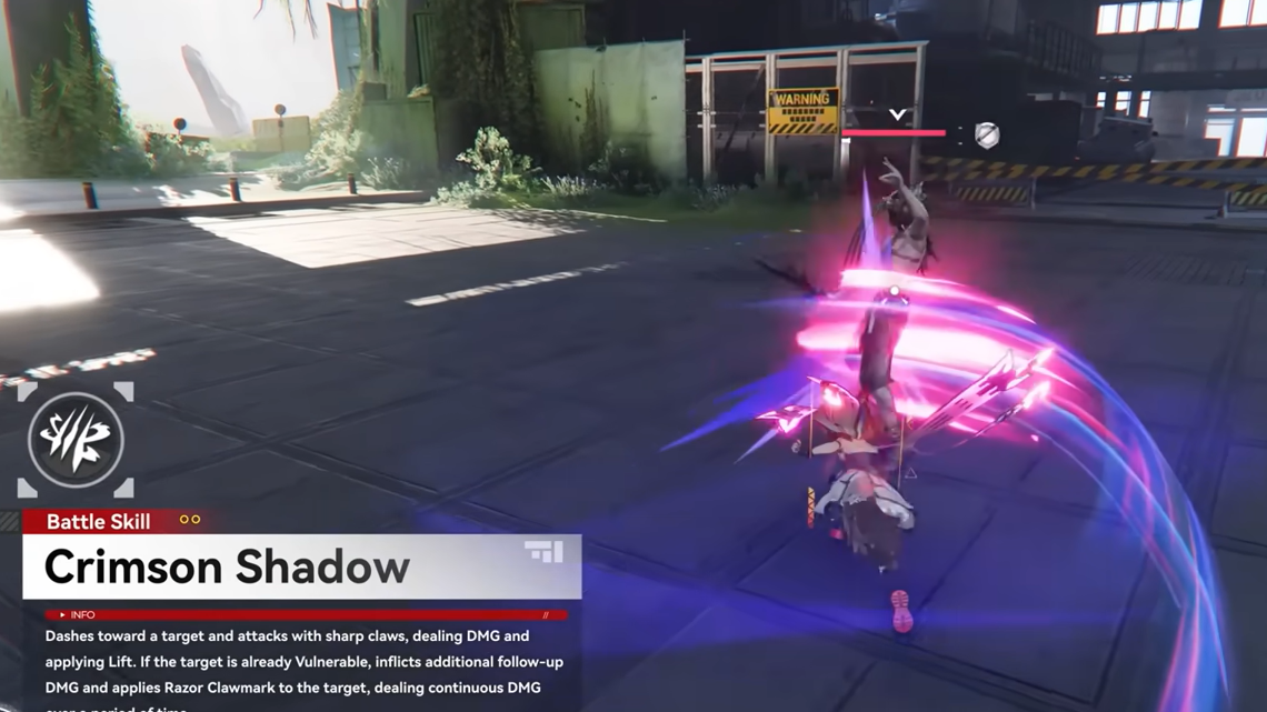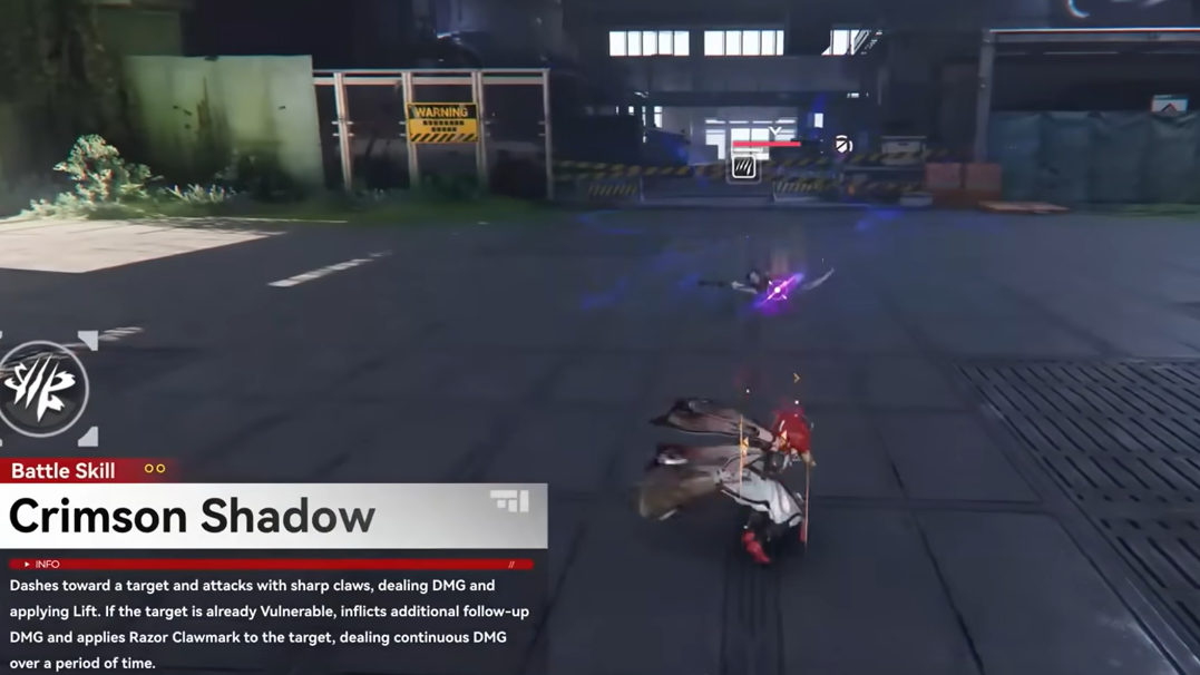 Rossi's basic attack chain is a five-hit physical damage combo. Her Battle Skill dashes to a target, deals physical damage, and applies Lift (a form of Vulnerability). If the target is already Vulnerable when the skill lands, she follows up with an additional heat damage hit and applies a Razor Claw Mark — a physical damage-over-time debuff. Enemies afflicted by the mark take increased physical and heat damage. Landing a critical hit on a marked enemy triggers her talent, which deals bonus damage and restores her HP; this healing and damage bonus is amplified further if the enemy is in a Combustion state.