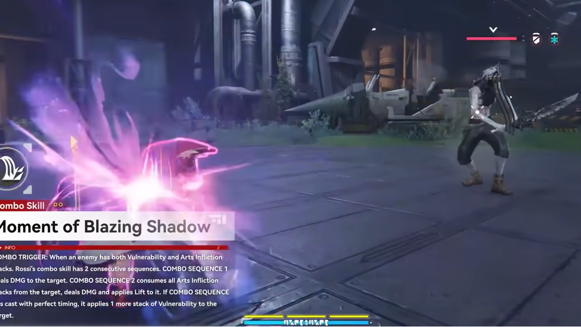 Rossi's Combo Skill is the first in Endfield to feature a timed input window — a quick-time element embedded in the second sequence. When the window opens, Rossi visually glows bright yellow, indicating the moment to press the skill input again. Executing it within that window applies the additional Vulnerability stack and increases her crit rate and crit damage temporarily. Missing the window still completes the second sequence and consumes the Arts Inflictions, but without the extra stack or the crit bonus.