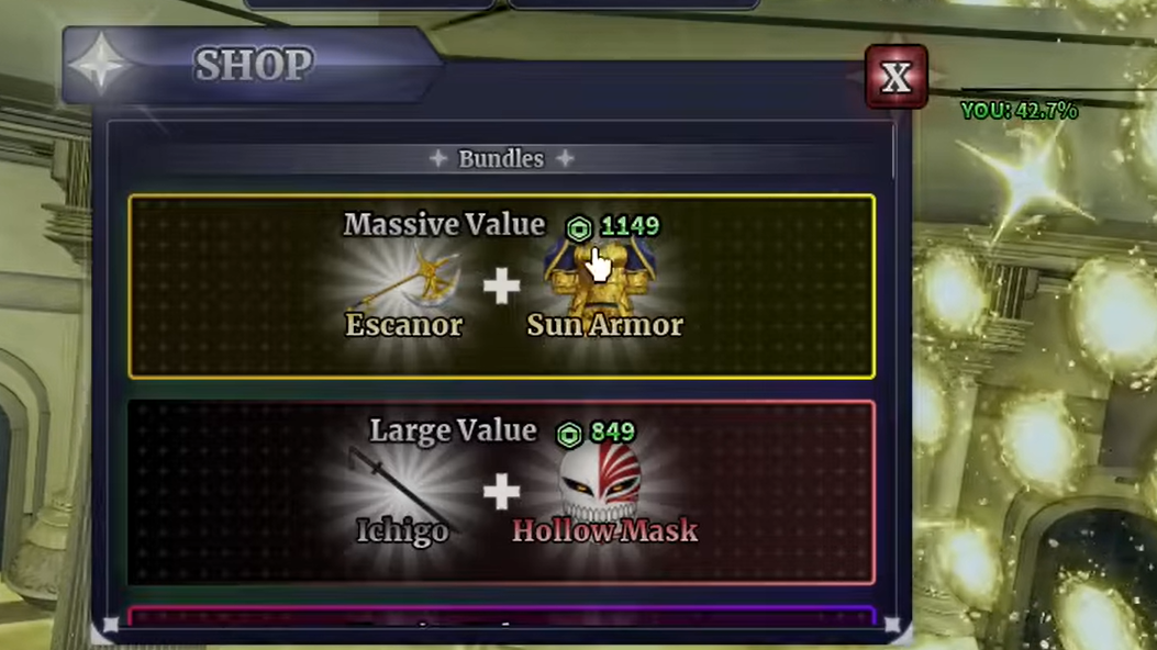 If grinding Boss Rush isn't appealing, the Escanor axe and Sun Armor are bundled together in the in-game shop for 1,199 Robux. Open the shop by pressing the store button on the left side of your screen — the bundle sits at the top of the listings. This is the fastest way to get the weapon and skips the Rush Key grind and the 19-trillion-HP boss fight entirely.
