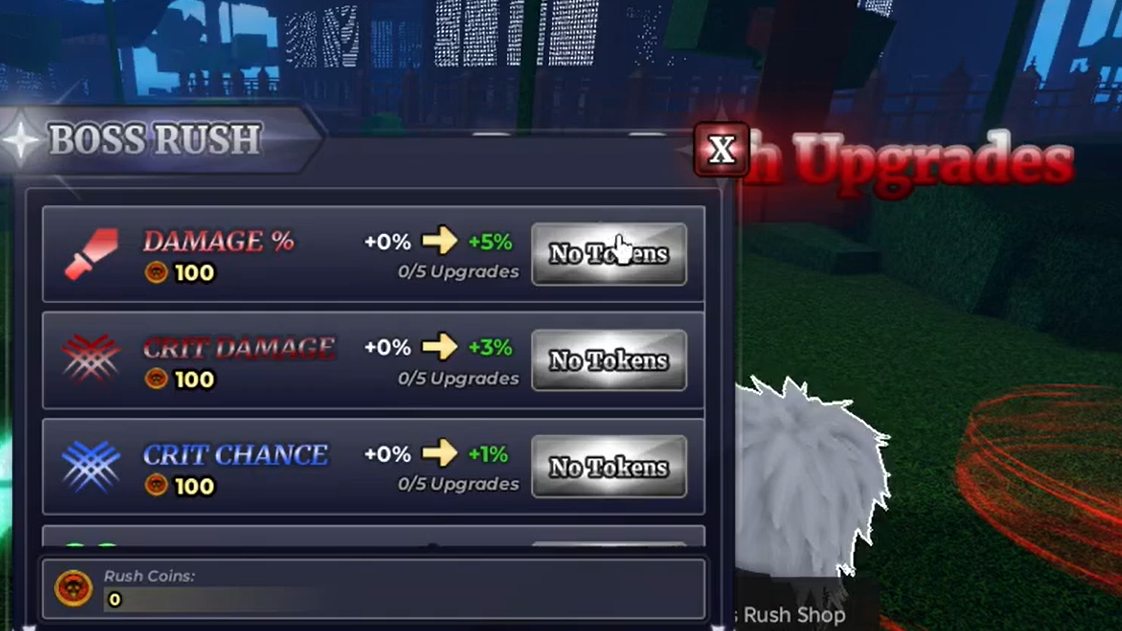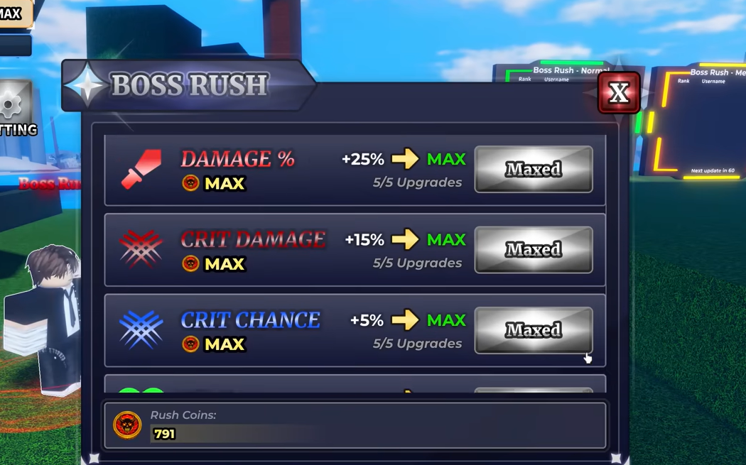 The Boss Rush Upgrades shop converts Rush Coins into permanent stat bonuses across Damage, Health, Crit Damage, Crit Chance, and Luck. Each stat caps at five levels, and fully maxing every track costs 6,625 Rush Coins.