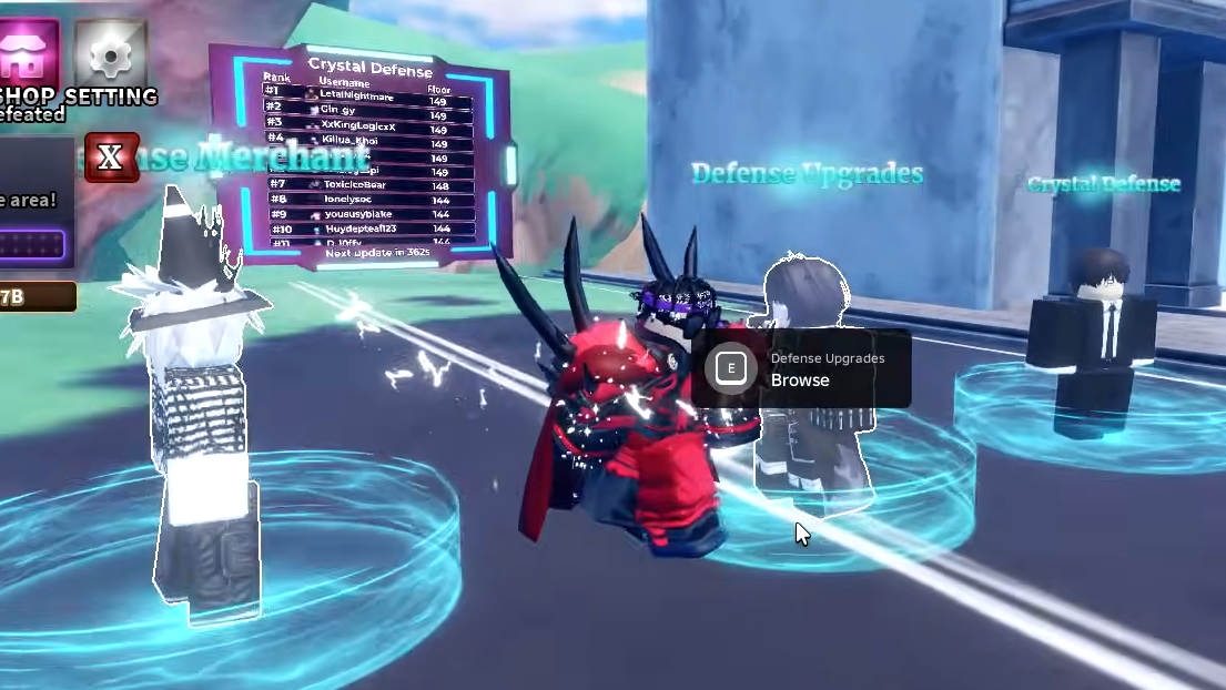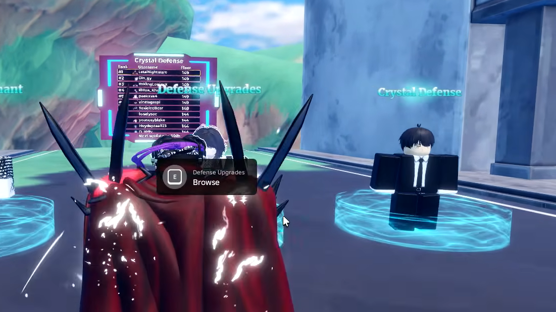 Crystal Defense sits on Punch Island in Sea 2. From the Punch Island spawn, take the left road past the Fast Ninja NPCs and continue straight, northwest of the Cosmic Being world boss. Three NPCs and a leaderboard mark the spot: the Defense Merchant, the Defense Upgrades NPC, and the run starter.