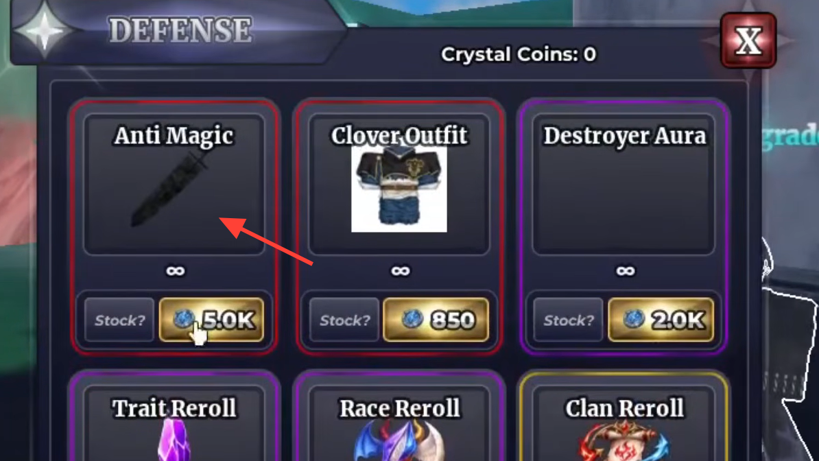 Anti Magic at 5,000 coins is the headline buy. The Clover Outfit and Destroyer Aura are cosmetic-leaning, while Bloodline Stone at 14 coins is the cheapest reliable source in the game right now.