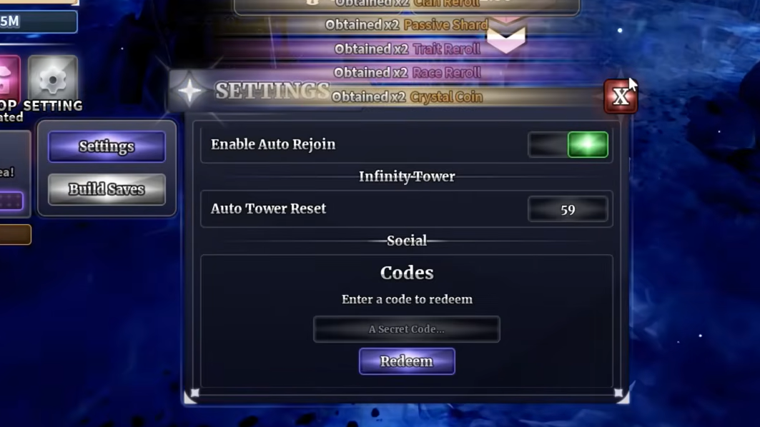 You earn 1 to 4 Crystal Coins per cleared wave, again scaled by luck. If the crystal is destroyed, the run fails, and you spend another Crystal Key to retry. There is also an auto-restart toggle in the in-run settings where you can type a target wave for AFK farming.