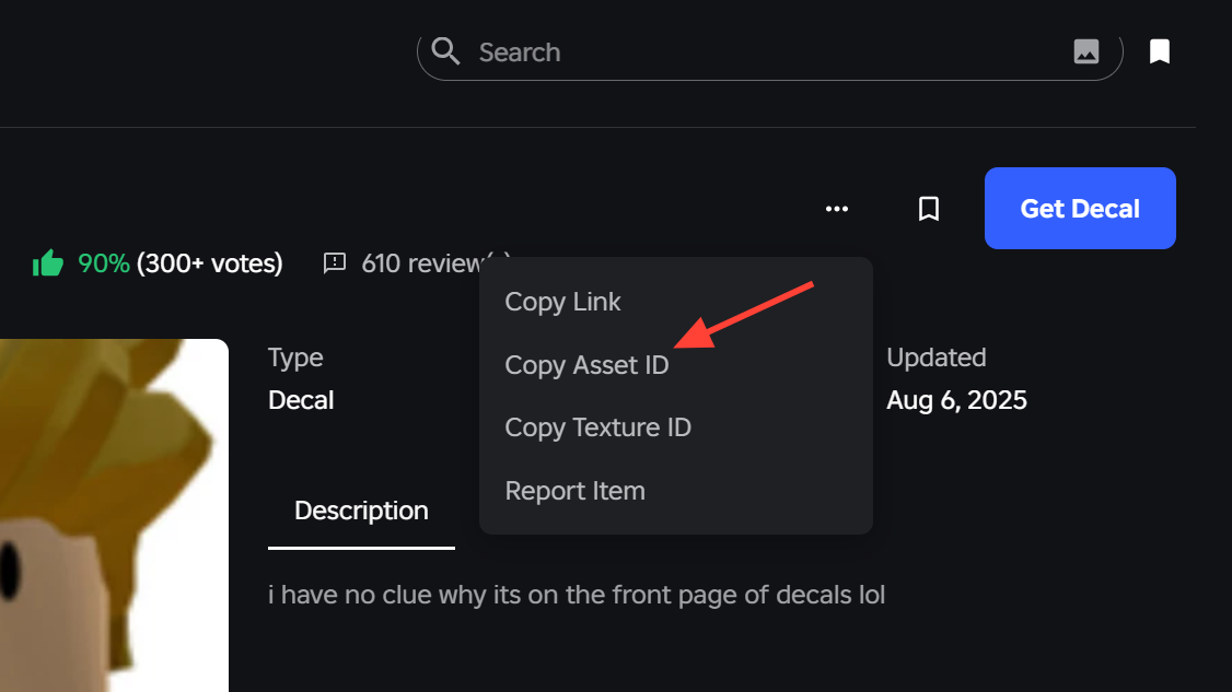 Step 2: Click on a decal to open its detail page. The asset ID is the long number at the end of the URL. You can also click the three-dot menu in the top right of the decal page and choose Copy Asset ID.